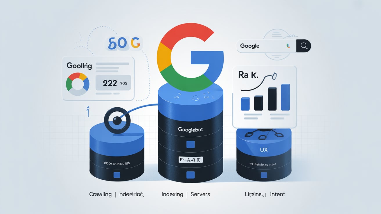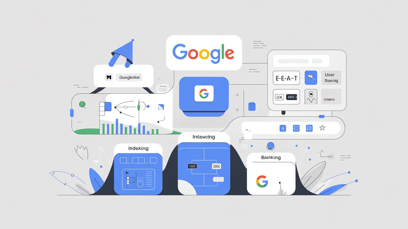 Illustration showing Google’s ranking system in 2026, including crawling, indexing, and ranking signals like E-E-A-T, UX, and backlinks.